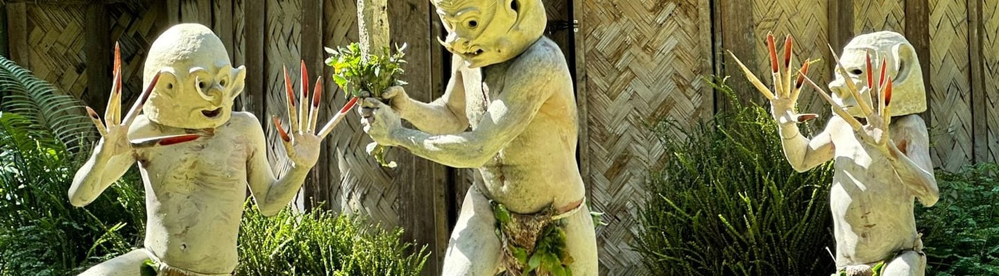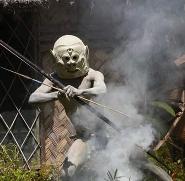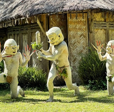 - 13.00pm Afternoon tour of Asaro Valley villages to see the Asaro Mud man, Meet the tribal dancers and participate in preparing and cooking traditional food under the earth oven, learn to do bow and arrow shooting and play the traditional bamboo flutes. Return to the Hotel.